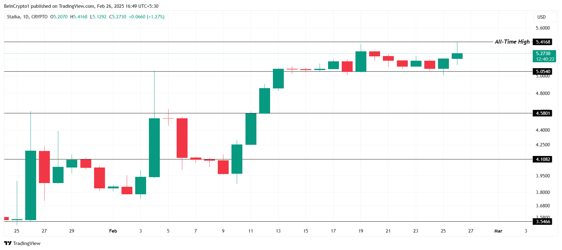 另一個山寨幣 Staika (STIK) 表現出色,達到新的歷史高點 5.41 美元。儘管市場整體看跌,該加密貨幣代幣仍穩定在 5.05 美元以上,防止進一步下跌。這種韌性顯示出投資者對其進一步增長的強烈信心。