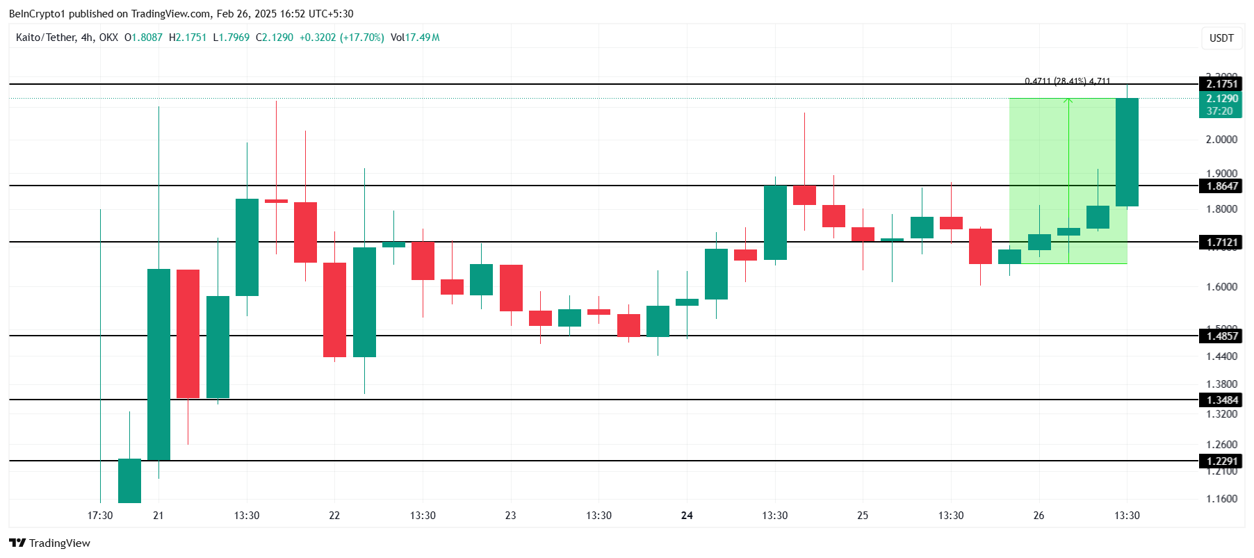 KAITO 的價格飆升 28%,達到 2.12 美元,並在日內上漲中短暫達到 2.17 美元的歷史新高。這一顯著增長突顯了強勁的投資者興趣和持續增長的潛力。該山寨幣的表現依然樂觀,若看漲動能持續,預示著上升趨勢。