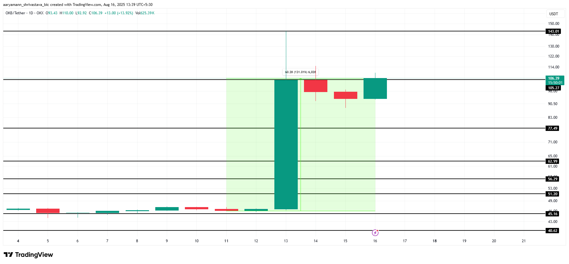 OKB 在过去一周内大涨 131%,在 CEX 代币中领跑。截至撰写本文时,OKB 正接近 105 美元的支撑位。如果该山寨币成功守住这一支撑,可能为进一步上涨铺平道路,甚至可能创下新高。