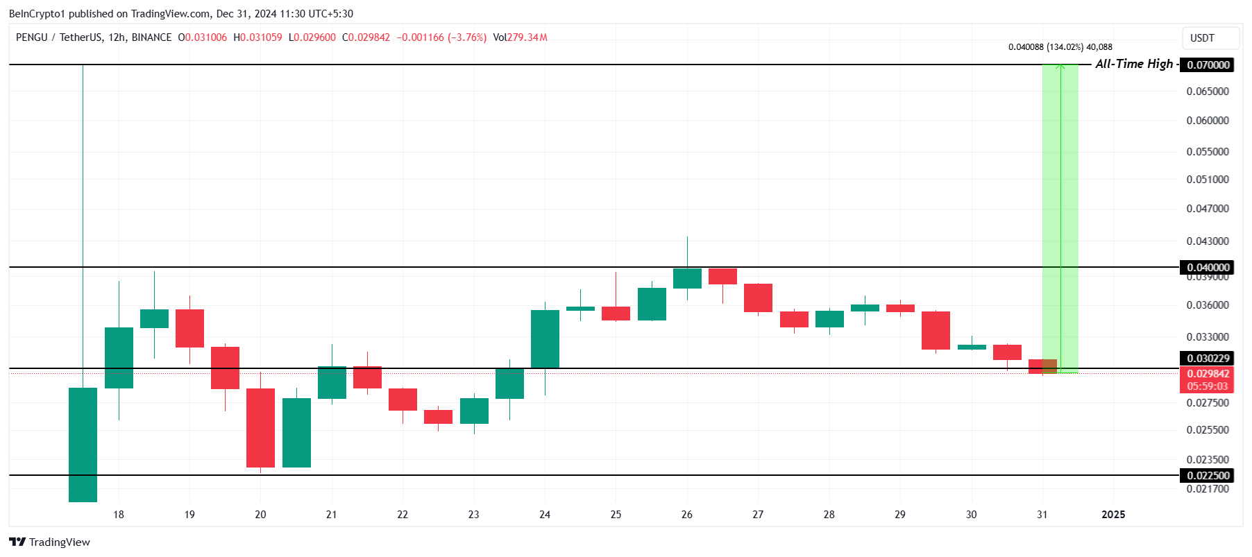雖然價格跳升 134% 的可能性不大,但 PENGU 可能會瞄準將 0.040 美元的阻力位轉為支撐。若能達成,將為這款迷因幣提供潛在漲勢的基礎。