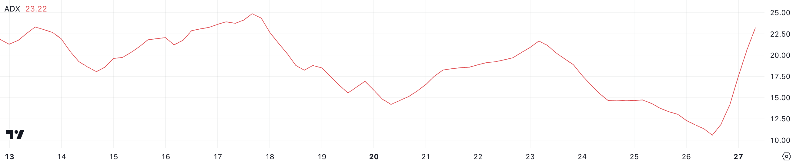 Cardano 的 ADX 急升至 23.2,從昨天的 10.5 上升,顯示市場從幾乎不存在的趨勢轉變為更明確的趨勢。