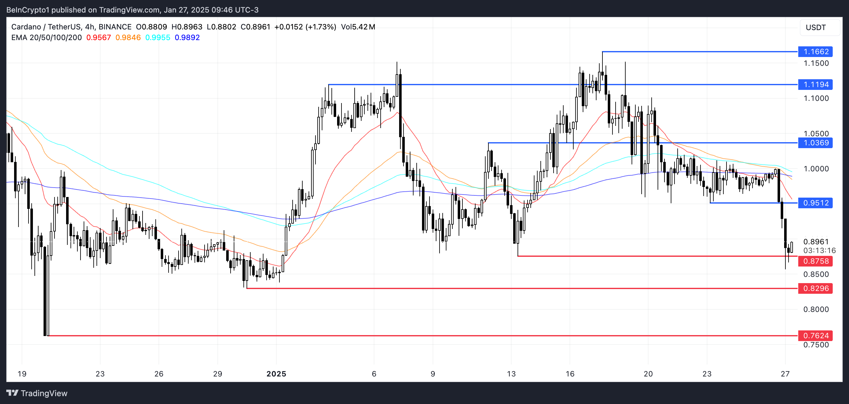 最近的死亡交叉和上升的 ADX 確認了下行趨勢加強,價格在 0.87 美元的關鍵支撐和 0.95 美元的阻力之間徘徊。如果看跌動能持續,ADA 可能進一步下跌,但若能回升至 0.95 美元以上,可能會測試超過 1.03 美元的水平。