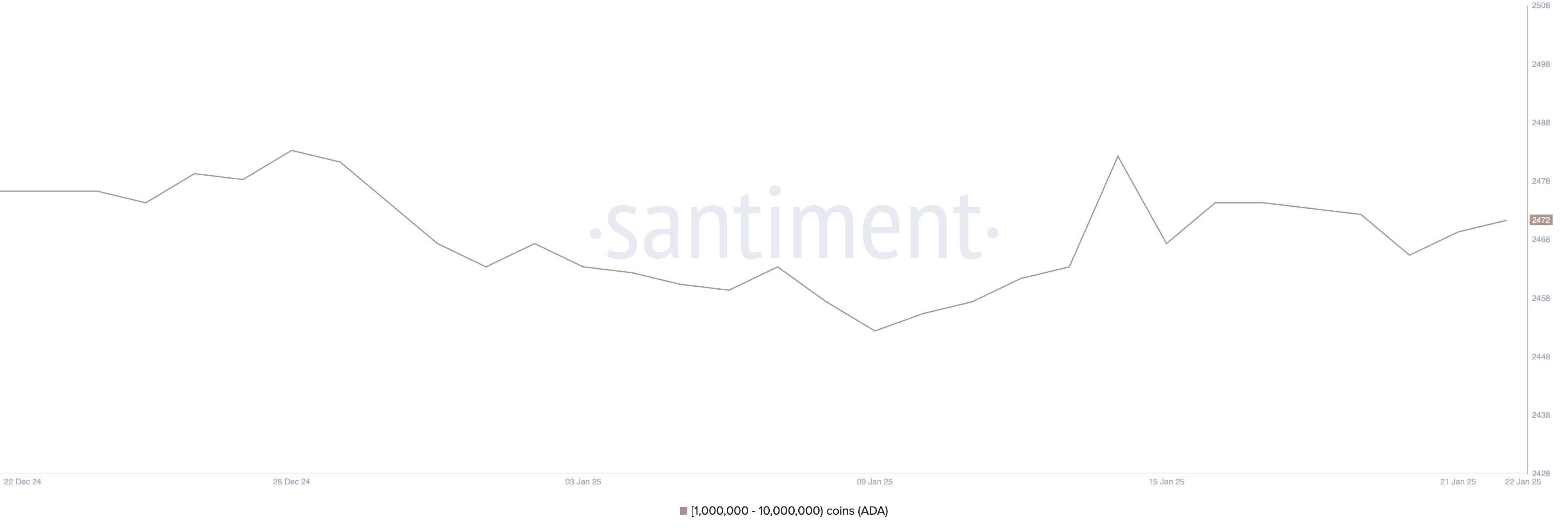 持有 100 萬至 1000 萬 ADA 的 Cardano 鯨魚地址數量在過去 3 天略增,從 2,466 增至 2,472,但仍低於 1 月 14 日的 2,483 地址高峰。