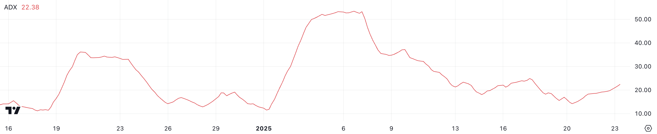 ADX 的急劇上升,測量趨勢強度不論方向,範圍為 0-100,顯示當前趨勢增強,從弱趨勢區(低於 20)進入新興趨勢區(20-25)。