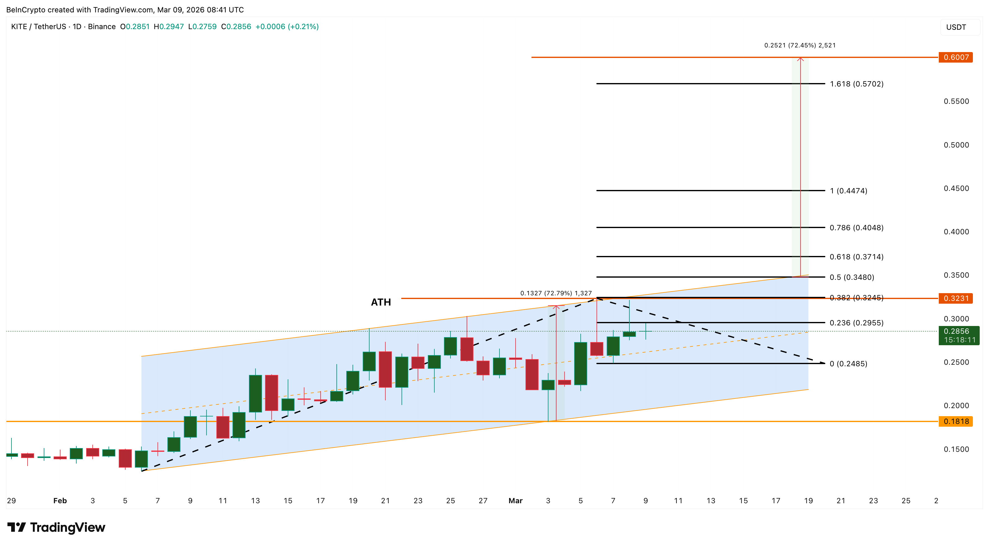 若 $KITE 成功突破 0.32 美元历史新高,上方首个阻力位预计在 0.34 美元,恰好位于通道上轨。一旦有效强势突破,该结构有望打开 0.57–0.60 美元新高目标区间,市场或迎来全新历史高点。