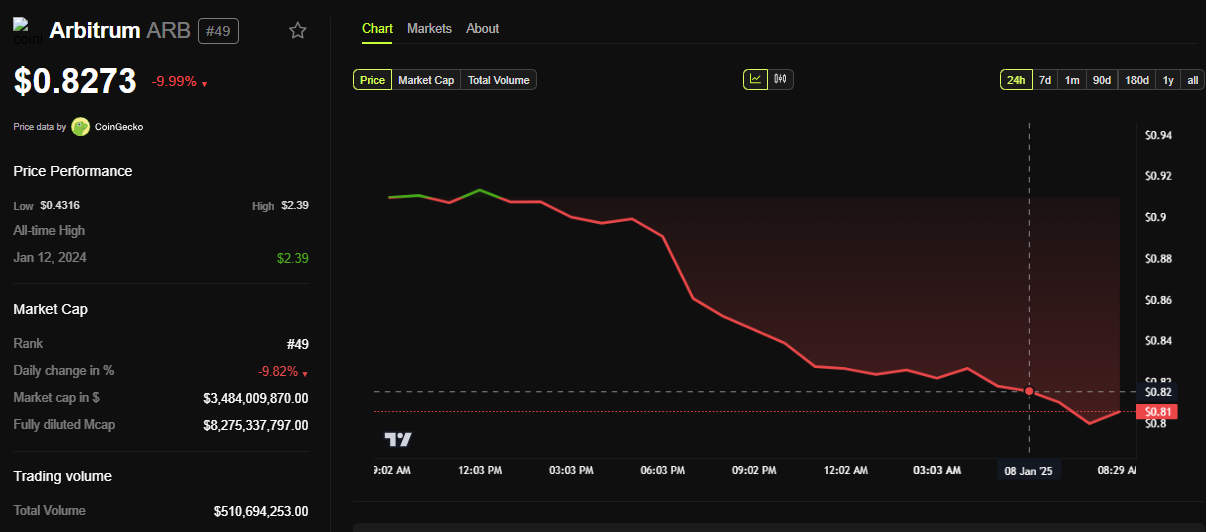 儘管有此公告,自週三交易開始以來,ARB 的價格已下跌近 10%。根據 BeInCrypto 的數據,目前交易價格為 0.827 美元。