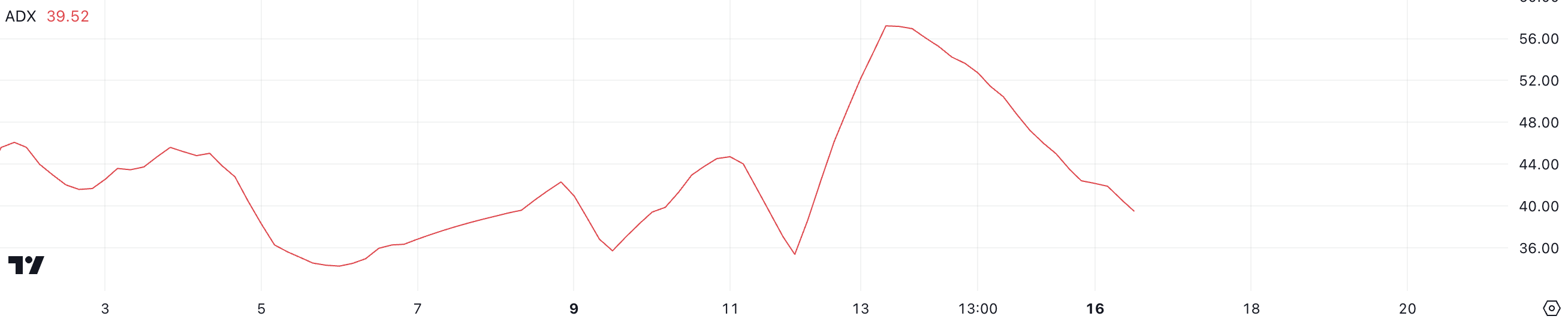 特拉瓦拉 平均方向指數 (ADX) 目前為 39.5,低於三天前的 57。ADX 衡量趨勢的強度,高於 25 表示強勁趨勢,低於 20 表示市場疲軟或沒有方向。