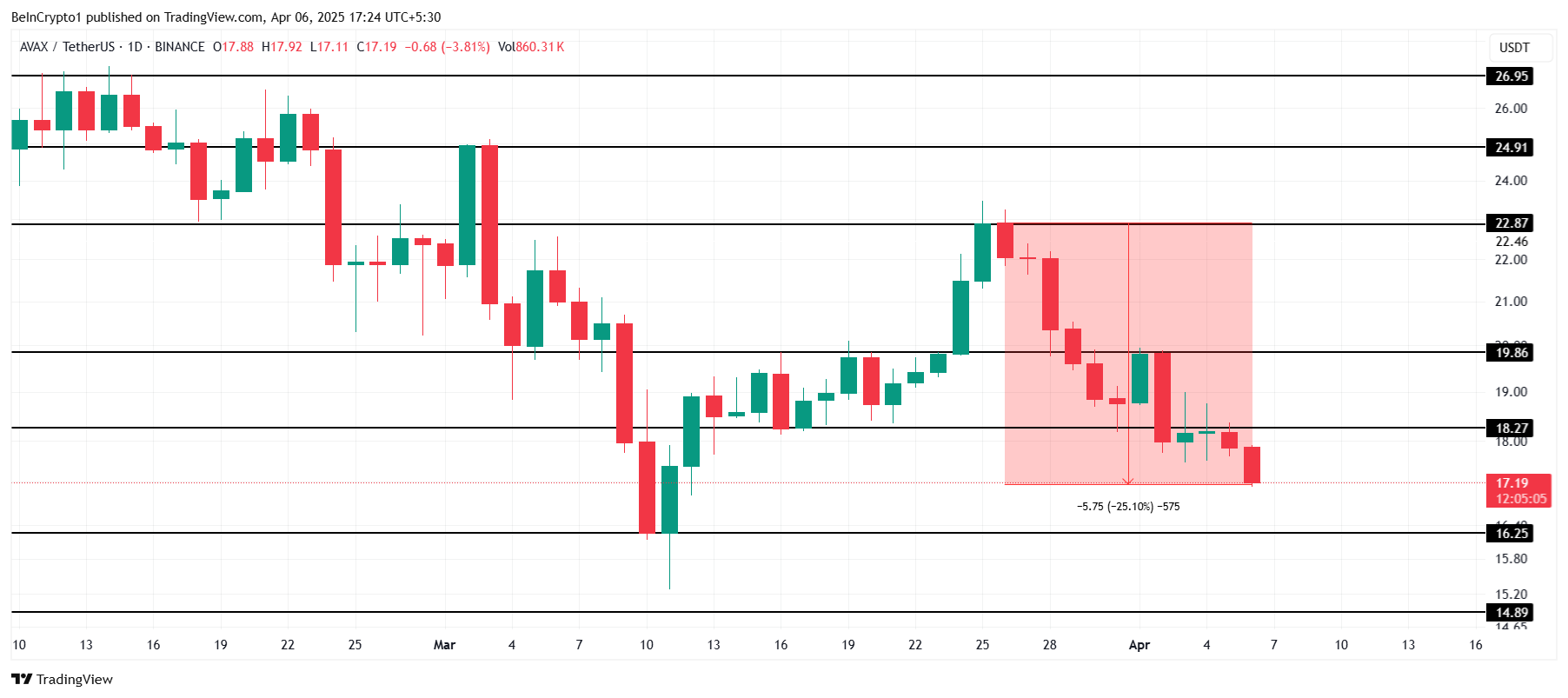 根據現有的市場信號,Avalanche 可能難以將 18.27 美元重新作為支撐位。如果該山寨幣無法穩住此水平,則有可能進一步下跌至 16.25 美元。這將加深投資者的損失並延遲任何復甦的機會。