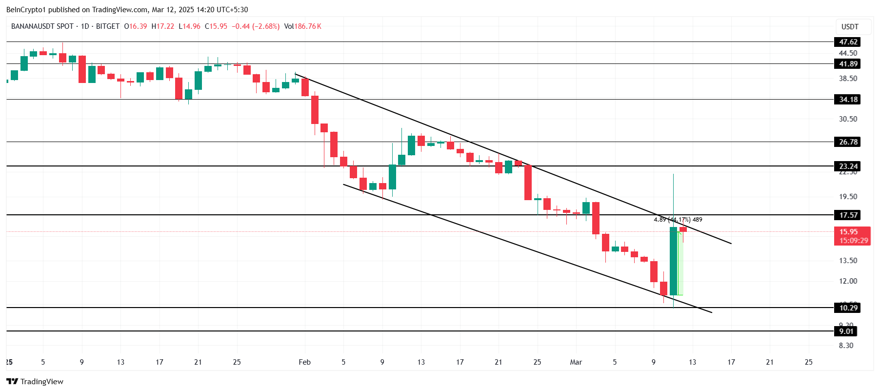 目前,Banana 交易價格為 15.95 美元,過去一天上漲 44%,處於通常預示看漲潛力的下降楔形形態中。然而,儘管有這種形態,該山寨幣在過去 24 小時內仍難以突破,未來走勢不明。