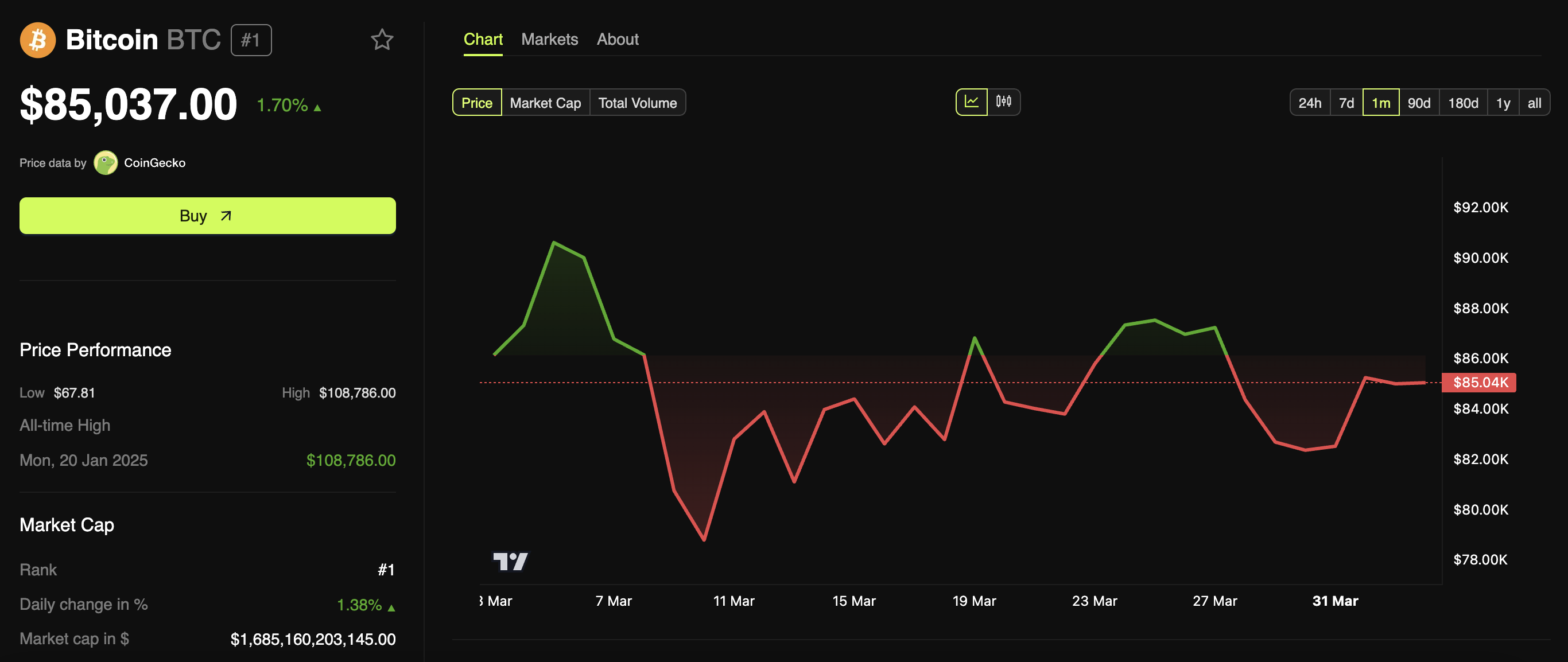 儘管如此,專家警告「解放日」可能帶來的市場波動,因為投資者仍不確定其對加密市場的影響。比特幣目前交易價格為 85,000 美元,過去 24 小時上漲 1.70%。
