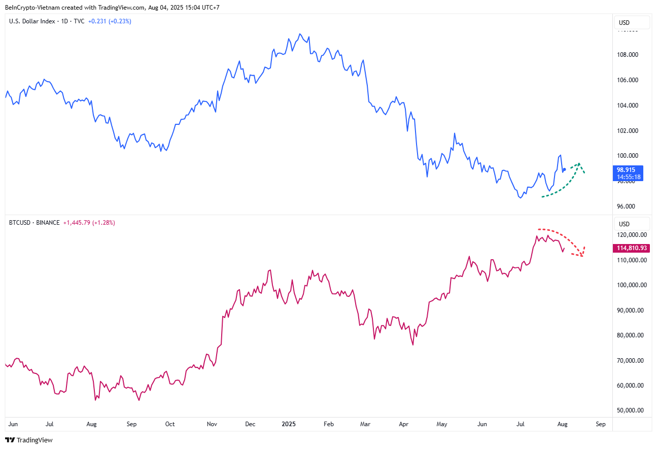 例如,当 DXY 从 96.7 点上升至 98.9 点时,比特币从 $120,000 下跌至 $114,000。分析师 John Kicklighter 认为,DXY 正在形成一个反头肩形态,这是一种经典的信号,预示着可能的上涨。