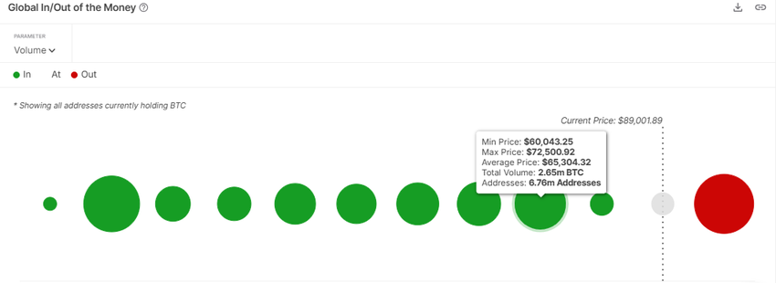 同時,比特幣的初步強力支撐位於 72,500 美元左右,約 676 萬個地址持有約 265 萬枚比特幣,購買的平均價格為 65,304 美元。