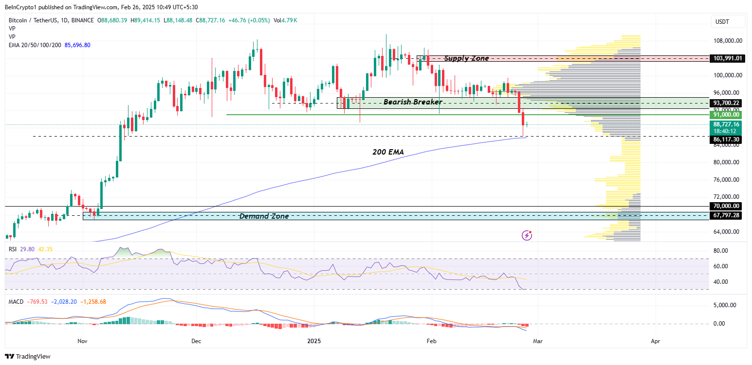 價格正接近 85,696 美元的 200 日 EMA,這提供了關鍵支撐。如果跌破這一點,可能會加速看跌動能。如果 200 EMA 失守,下一個主要支撐位於 67,797 至 70,000 美元的需求區,買家可能會介入。
