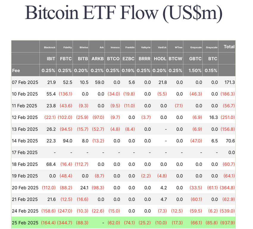 根據 Farside Investors 和 Trader T 的分析數據顯示,比特幣 ETF 淨流出量在週二達到 9.37 億美元。Fidelity 的 FBTC 領導這些流出,達到 3.44 億美元,其次是 BlackRock 的 IBIT,贖回 1.64 億美元。