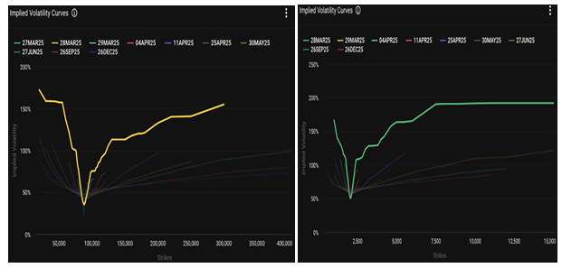 Deribit 指出:「圖 1 – $BTC:比特幣顯示出嚴重的上行偏斜,看漲期權定價遠高。圖 2 – $ETH:以太坊的曲線較平坦,但整體交易量仍然很高。兩個市場都預示著到期或到期後的波動。」