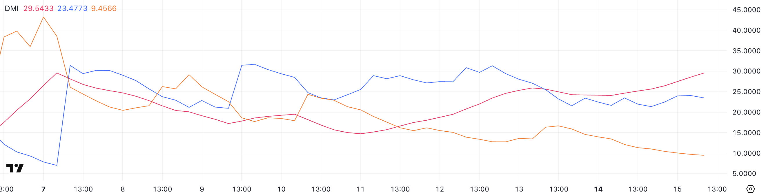 觀察這些方向性指標,+DI 目前為 23.47,過去兩天保持在 21 至 23 之間。