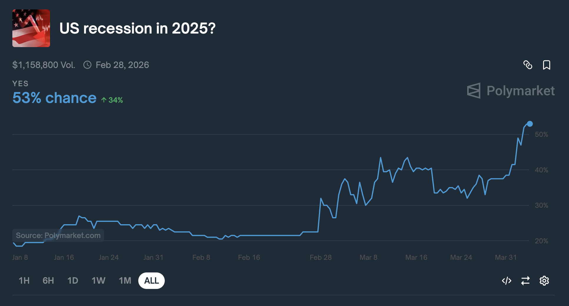 2025 年美國經濟衰退的可能性首次超過 50%,目前為 53%。