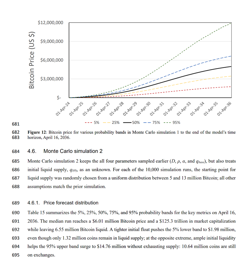 更新后的结果显示,到 2036 年 4 月,比特币有 75% 的概率超过 481 万美元。而 25% 的概率区间达到 1,022 万美元,95% 的上限则在 1,189 万美元到 1,476 万美元之间,具体取决于模拟参数。在最极端的 1% 模拟中,价格峰值接近 5,000 万美元。中位数预测在同一日期约为 655 万美元到 696 万美元。