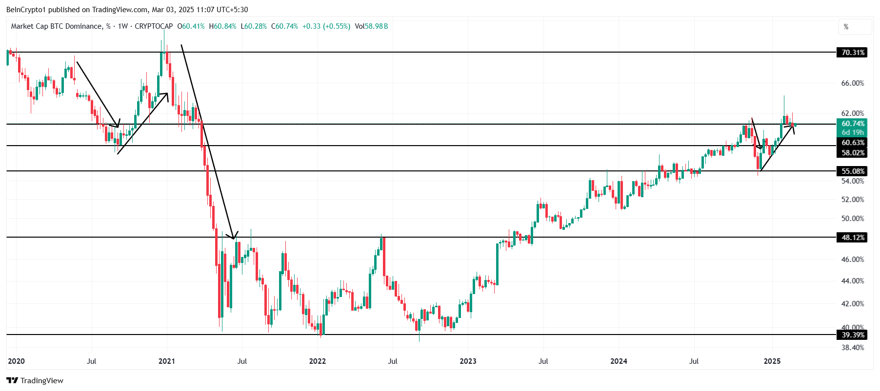 比特幣的主導地位為 60.74%,形成了類似於 2020-2021 年的分形,當時它在急劇上漲後下跌。類似的趨勢正在出現,表明歷史模式可能重演。比特幣的價格在主導地位下降期間,偶爾顯示出復甦跡象,但此類走勢的強度和可持續性取決於更廣泛的市場條件。