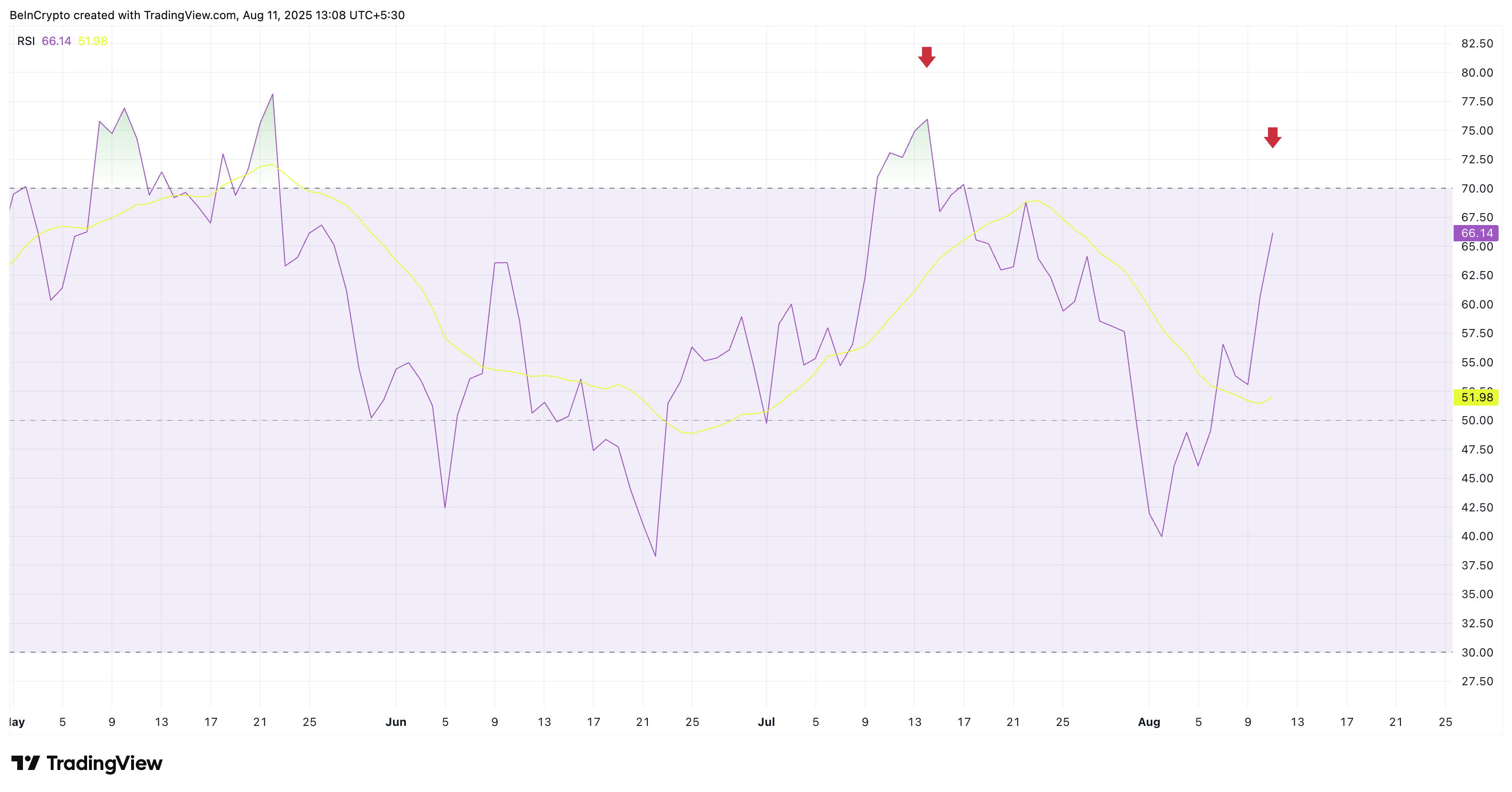相对强弱指数(RSI)对此提供了支持。7月14日,RSI处于超买区域,超过75,限制了进一步的上涨空间。目前,RSI接近66,价格仅比历史高点低0.6%,远低于超买阈值,这为比特币价格的上涨提供了更多“空间”,在技术上尚未达到疲惫状态。