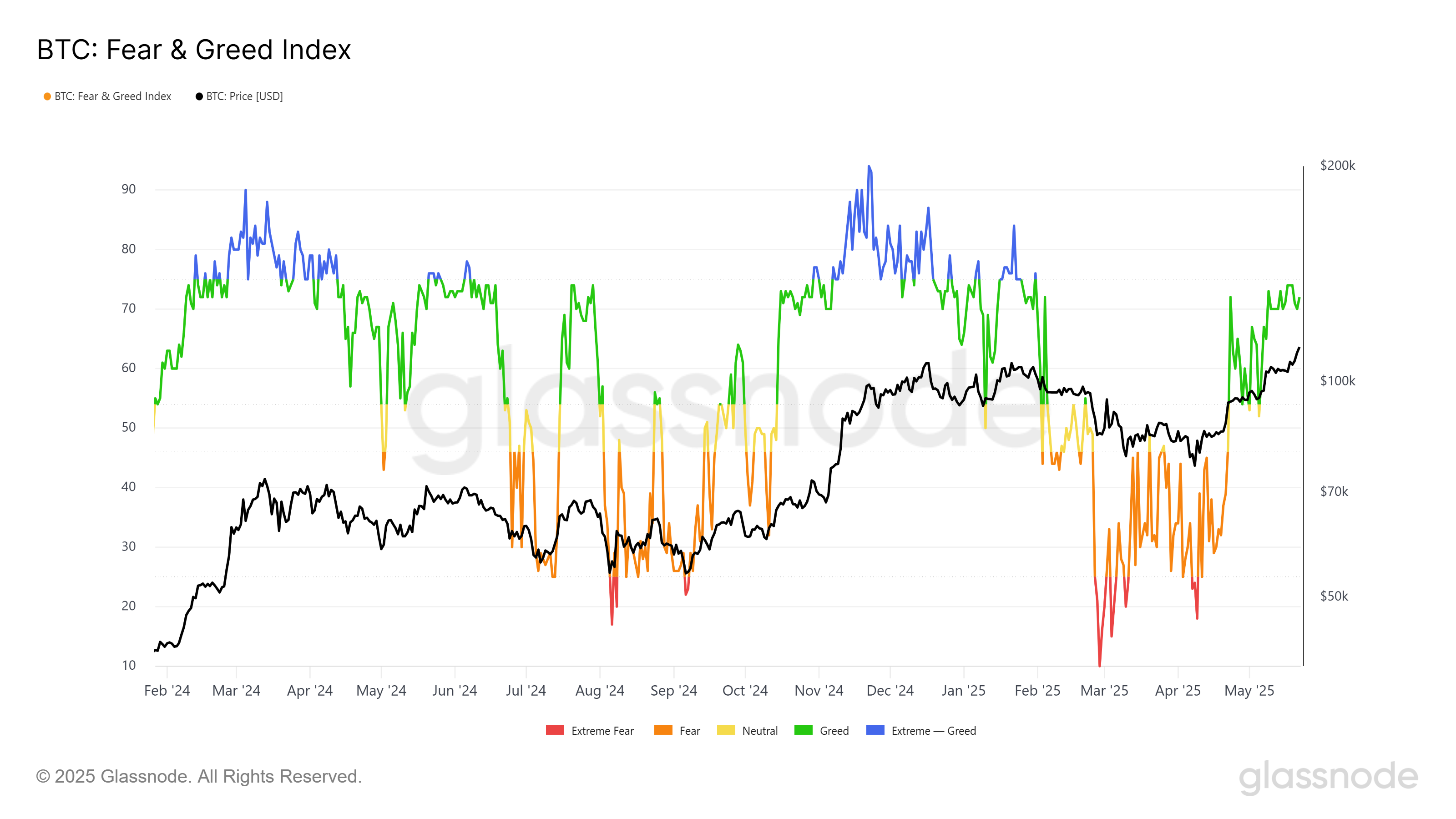 然而,比特幣尚未達到這一門檻,仍有進一步價格上漲的空間。這表明市場尚未進入超買區域,仍有顯著的上行潛力。該指數位於貪婪區,顯示投資者對比特幣未來價格走勢持樂觀態度。
