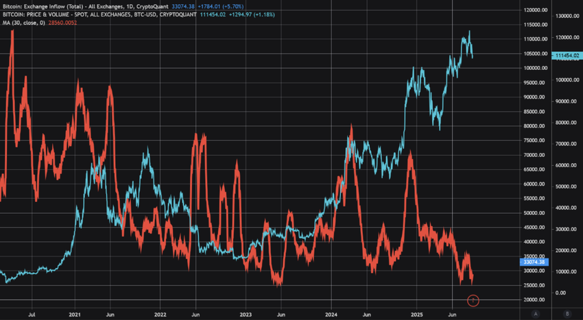 比特币价格再次上涨。周二跌至 108,600 美元,但很快又短暂反弹至 112,000 美元以上。卖压一度增加,导致交易所流入量激增。现在,这些流入量再次下降。