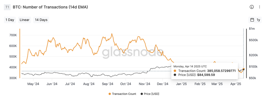 最新數據證實了這一點。自 2024 年最後一季度以來,比特幣交易數量大幅下降。根據 Glassnode 的數據,11 月比特幣交易超過 610,684 筆,但到 4 月時已降至 376,369 筆。