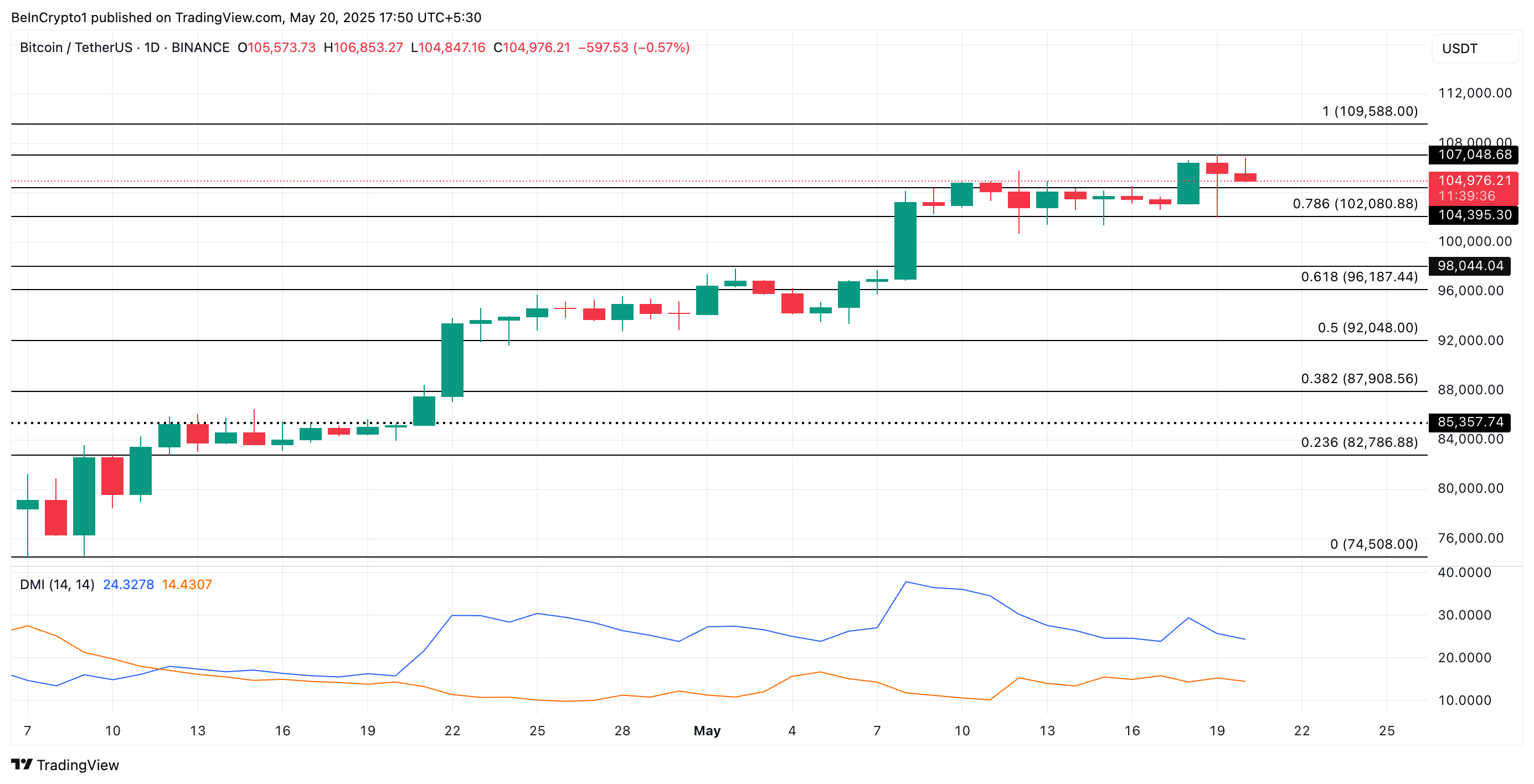 在日線圖上,比特幣的方向性移動指標(DMI)確認了市場中的看漲壓力。截至目前,該幣的正向指數(+DI,藍色)高於其負向指數(-DI,橙色)。
