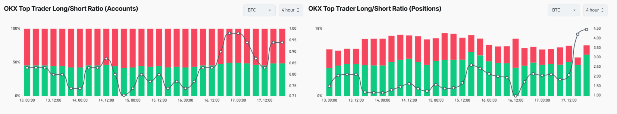 在OKX市場,基於持倉的比率在波動後劇烈變動。這顯示 較大的交易員迅速重新定位,要麼買入跌點,要麼在清算過程中調整避險。