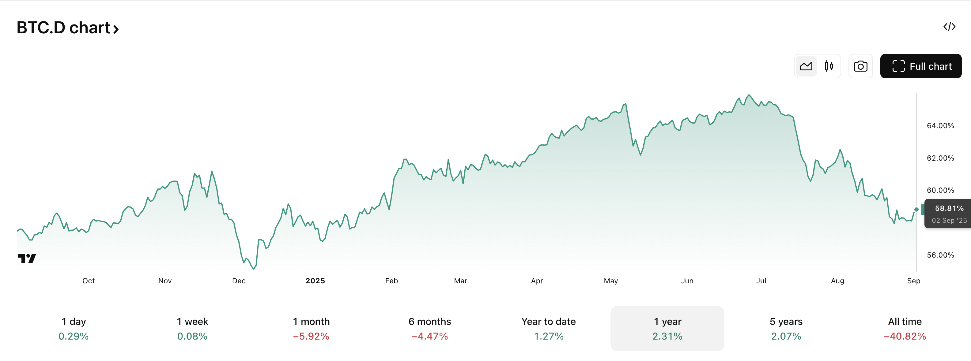 与此同时,比特币的主导地位从 57.46% 上升到 58.82%,而以太坊的主导地位则从 15.02% 下降到 13.79%。