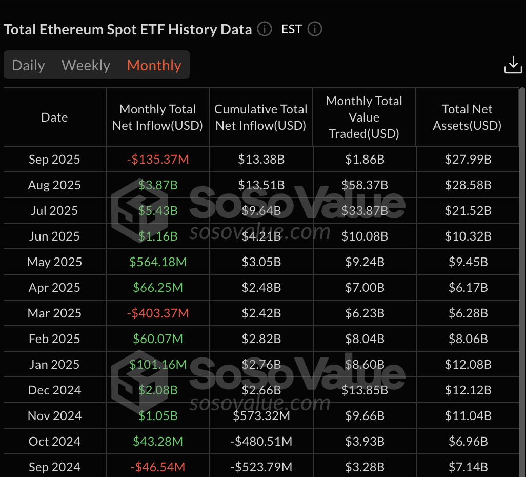 但深入分析 2025 年 9 月的数据则显示出不同的情况。截至目前,以太坊 ETF 已经出现了近 1.35 亿美元的净流出。