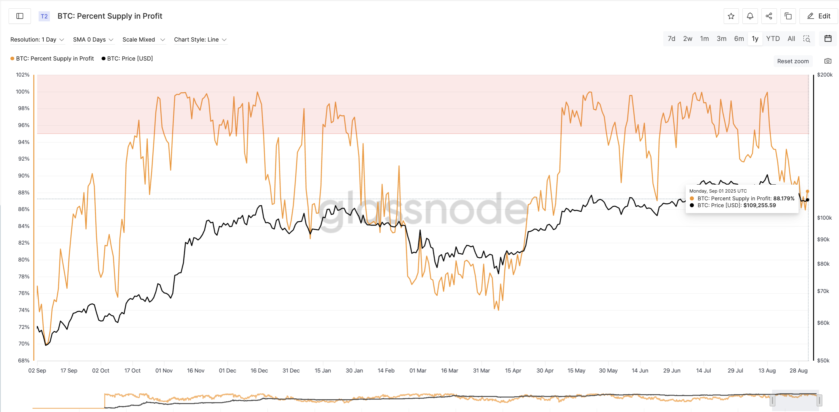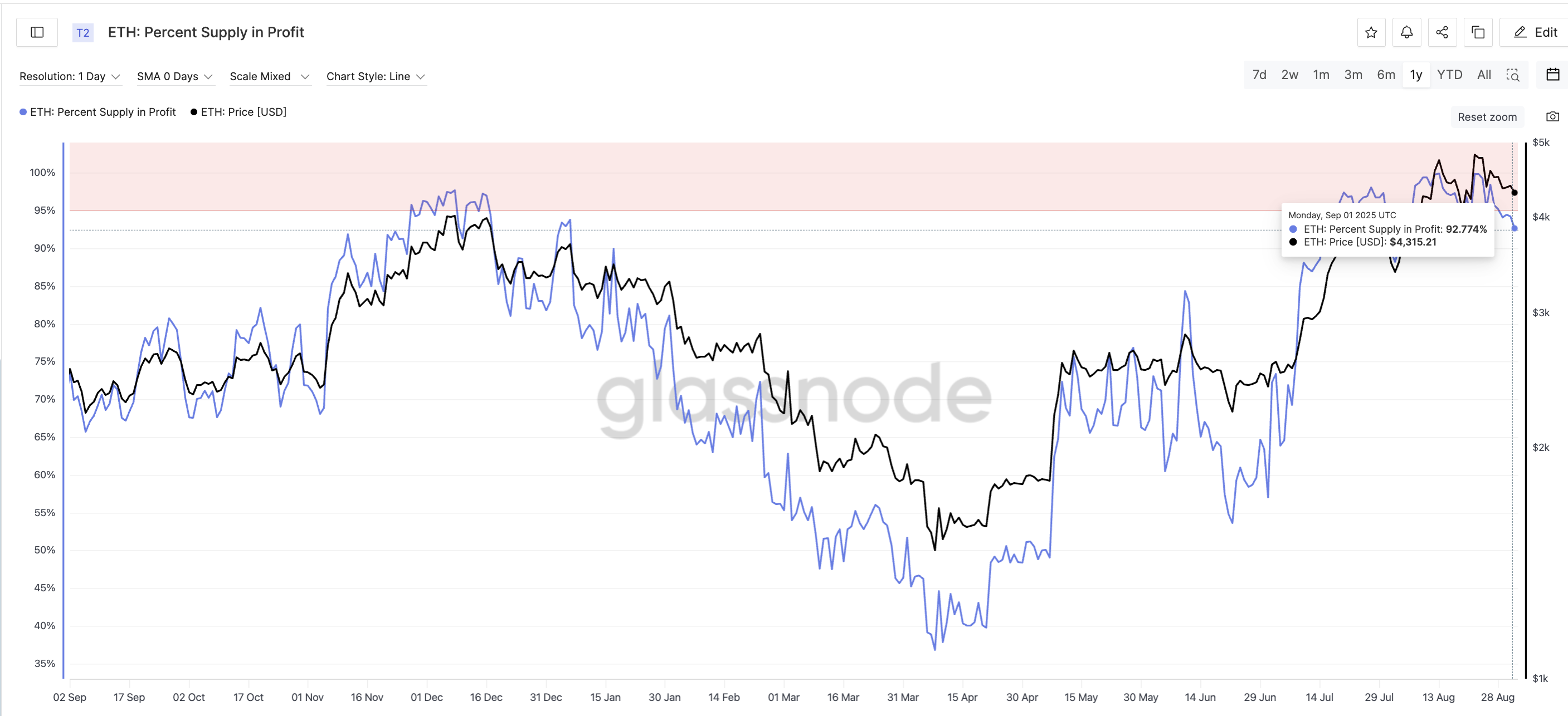目前,比特币和以太坊的盈利供应比例都比一年前高得多。比特币的比例从 2024 年 9 月的 76.91% 上升到 2025 年 9 月的 88.17%。以太坊的比例则从 73.83% 跃升至 92.77%。