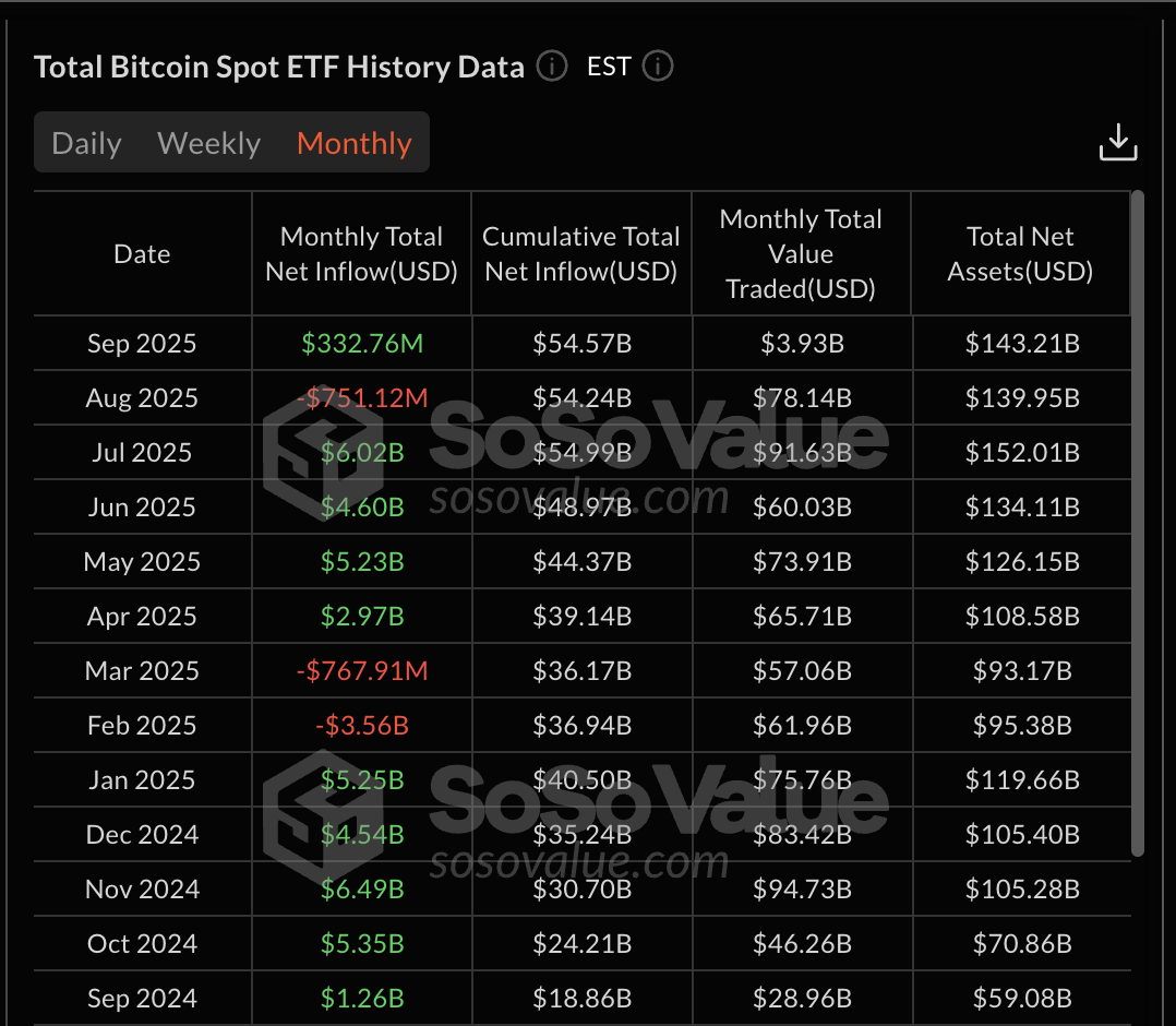这与去年 9 月的类似趋势相似,当时也是负面的。相比之下,比特币在今年 9 月初实现了 3.32 亿美元的净流入,与 2024 年 9 月 BTC ETF 录得 12.6 亿美元的收益相似。