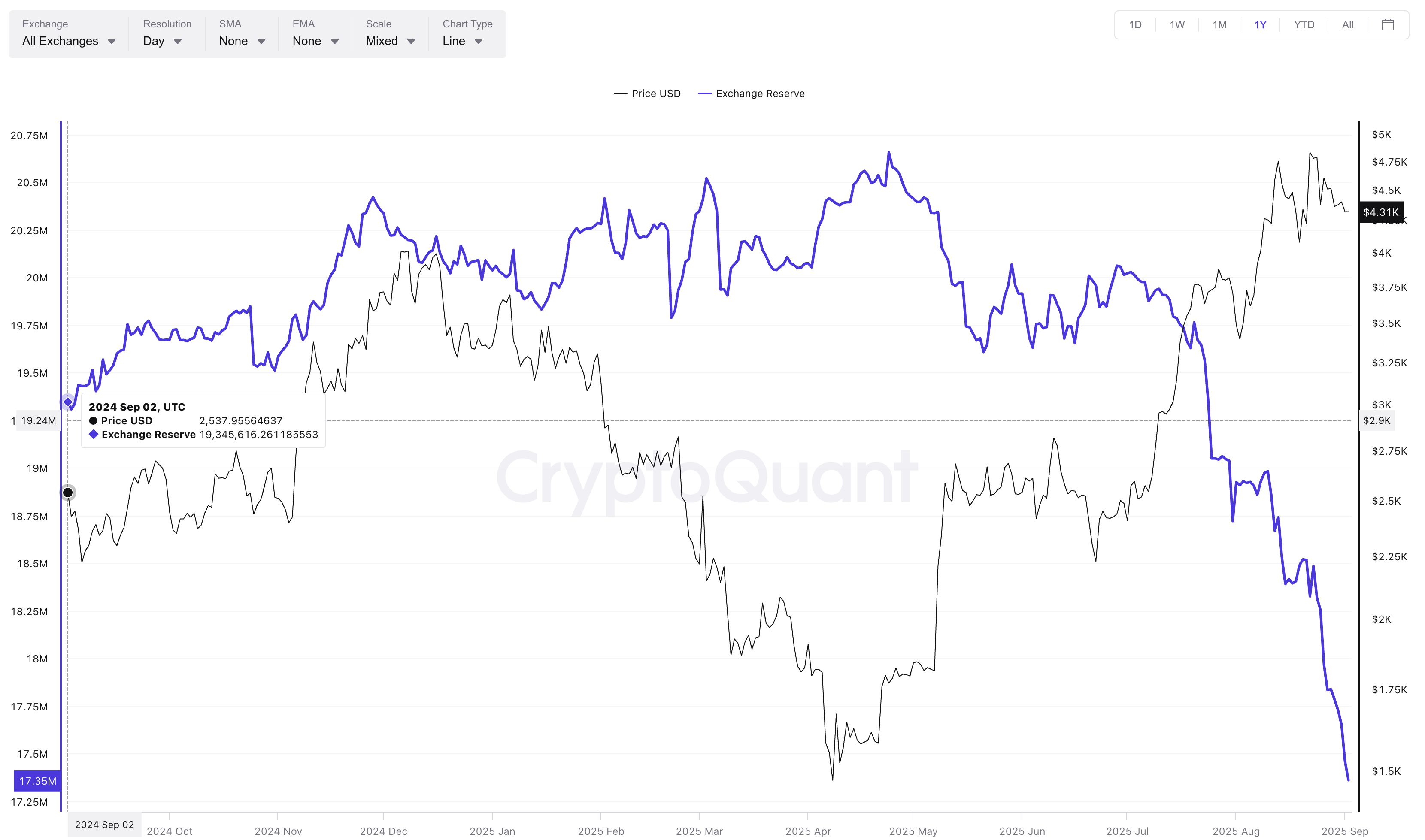 比特币的交易所储备较去年 9 月下降了约 18.3%,而以太坊的储备则减少了约 10.3%。这显得颇为有趣,考虑到这两种资产目前的交易价格都接近其历史高点。
