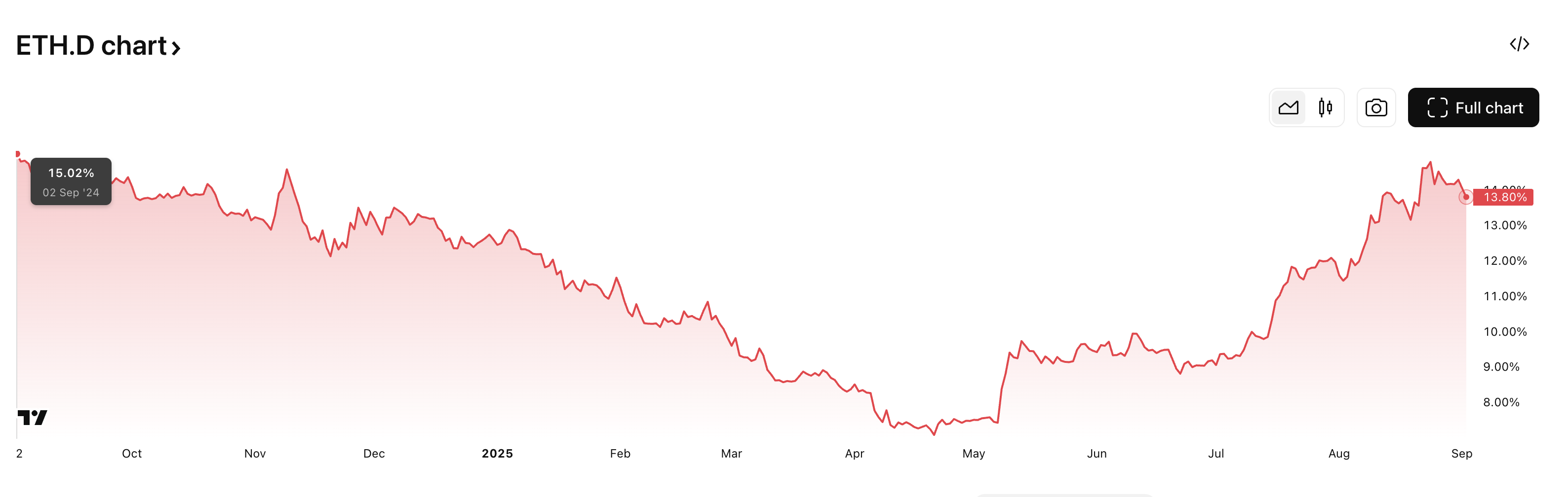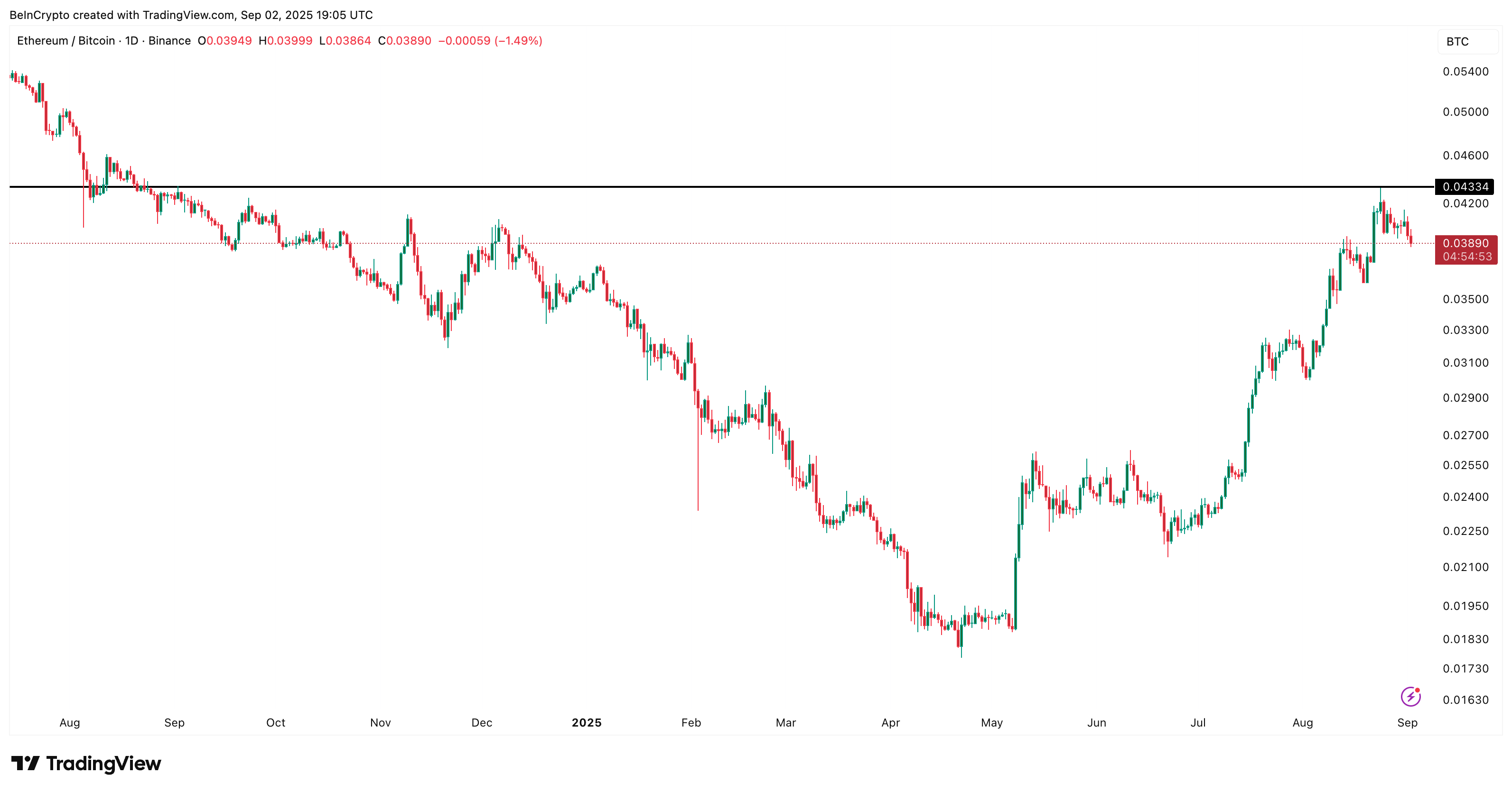 ETH/BTC 比率从去年 9 月的 0.043 下降到今天的 0.038。