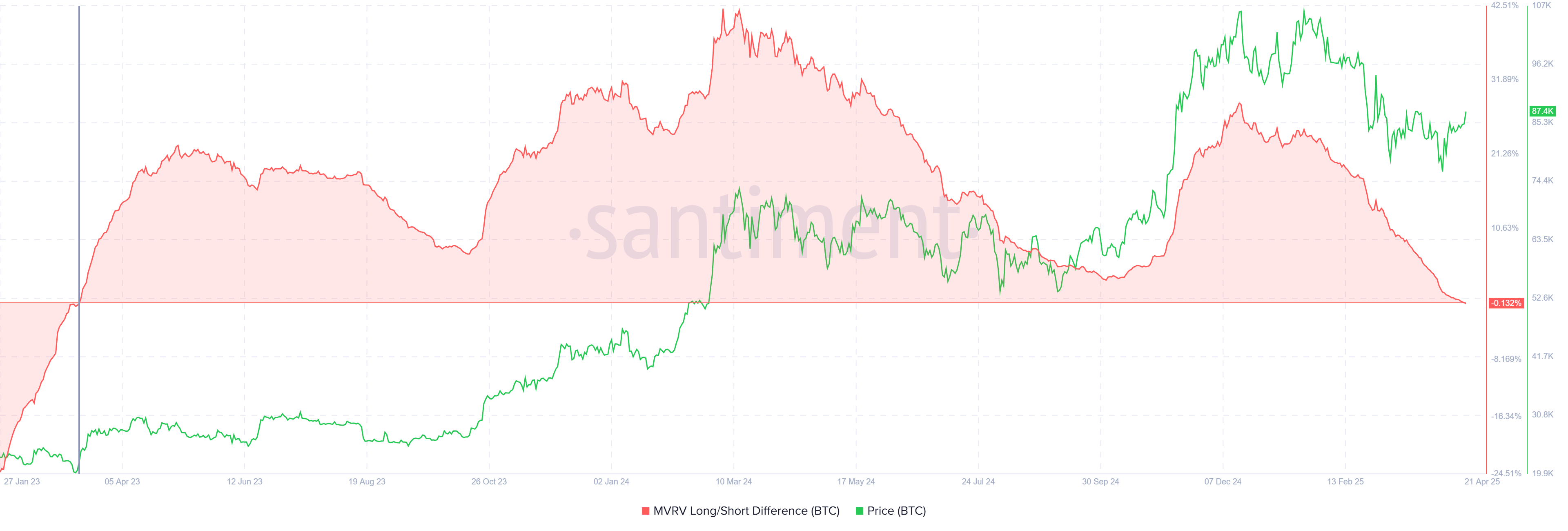 比特幣 MVRV 長短差異。來源:Santiment