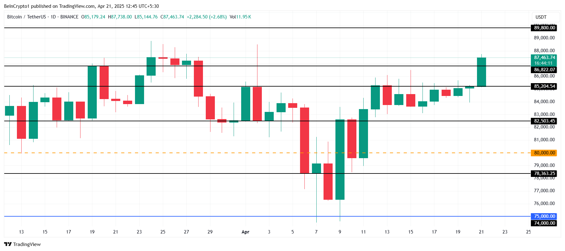 比特幣目前的交易價格為 87,463 美元,保持在 86,822 美元的關鍵支撐位之上。上次比特幣未能守住此支撐位時,價格大幅下跌。然而,若比特幣能維持在 86,822 美元之上,則有望向下一個阻力位 89,800 美元邁進。
