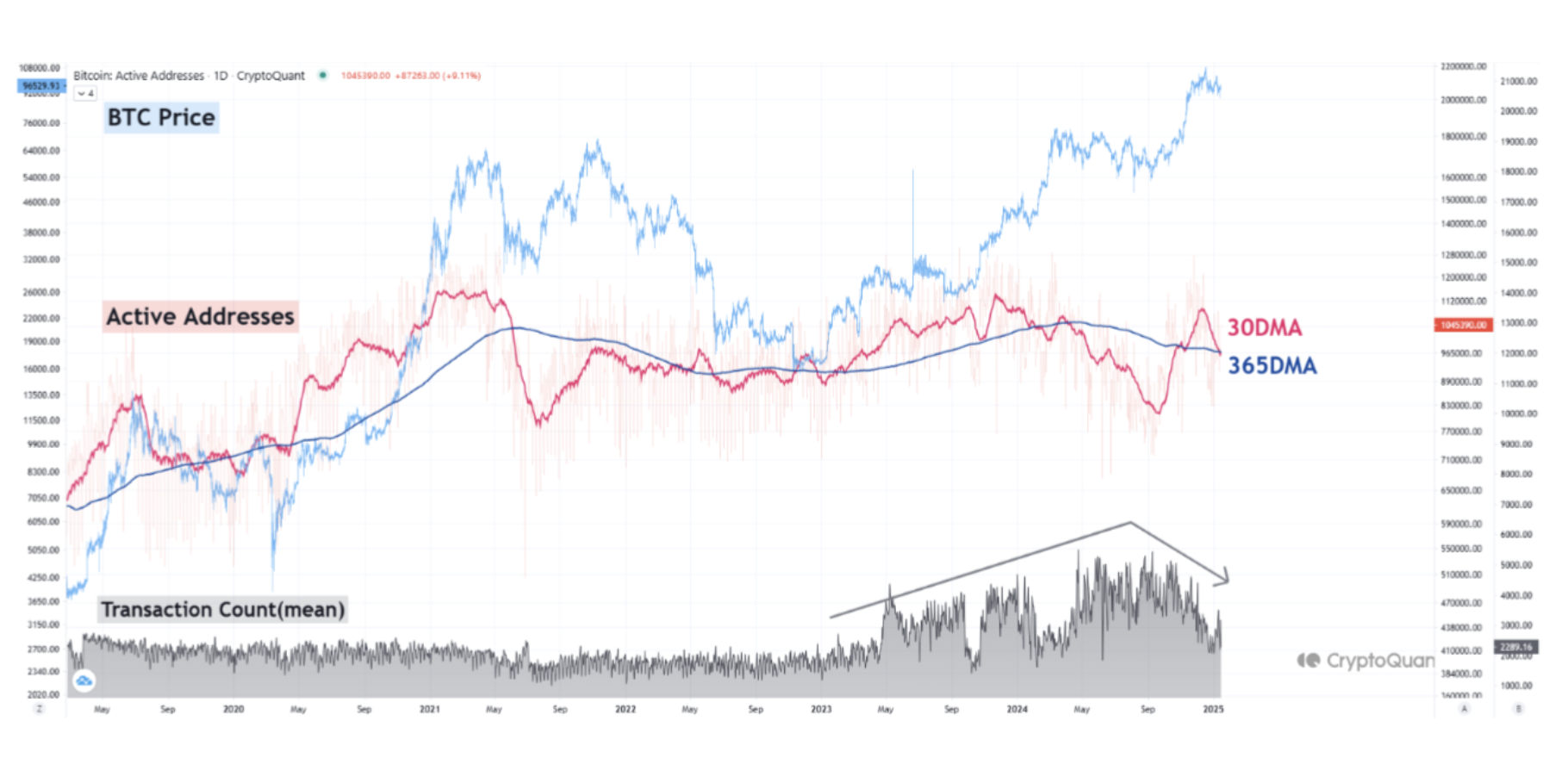 「歷史上,活躍地址的類似模式通常與熊市條件一致,這可能是一個負面指標。」他解釋道。