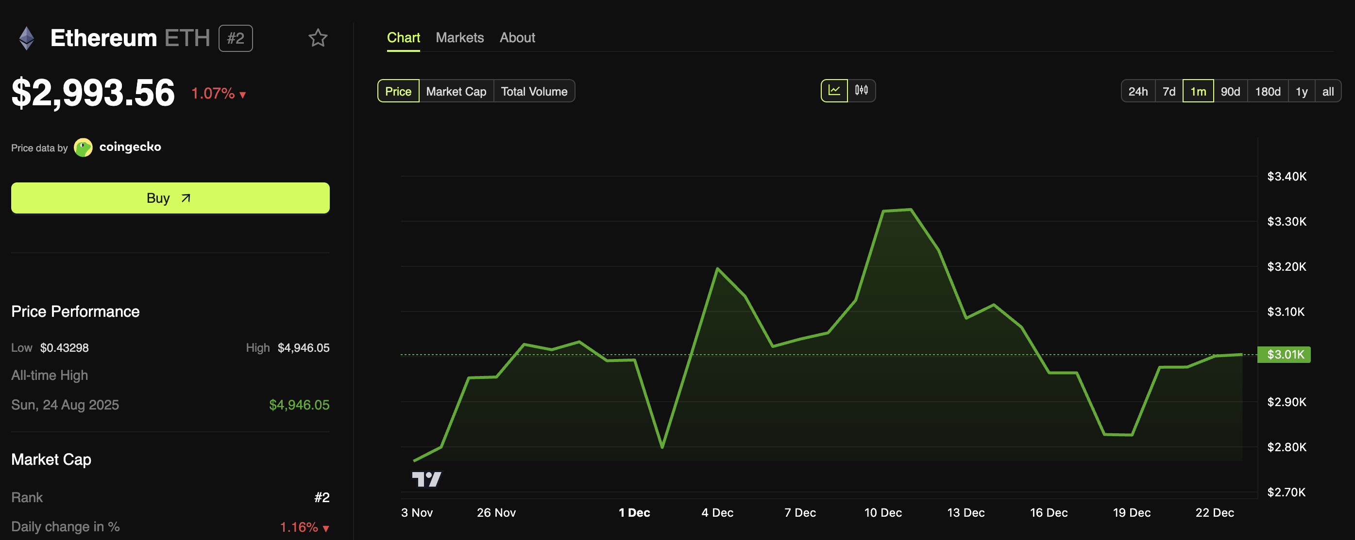 BitMine 加仓正值 $ETH 及整个加密市场波动持续加剧。今日亚盘早盘,$ETH 再次跌破 3,000 美元关口,过去 24 小时内币价下跌超 1%。