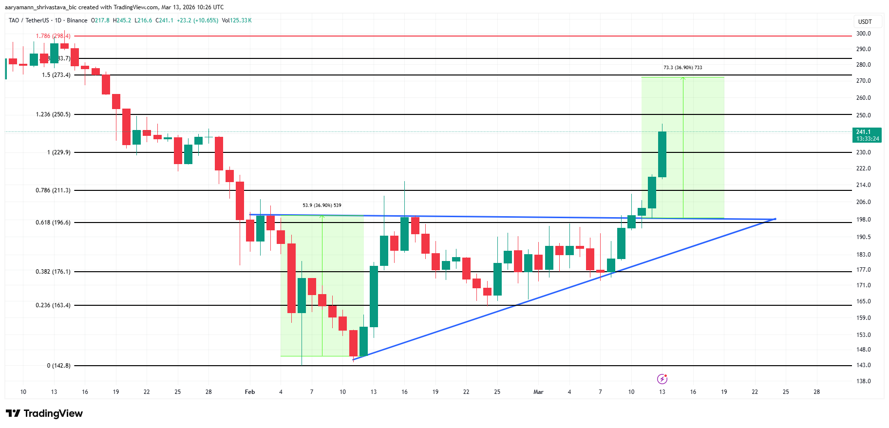 在近期上涨行情中,$TAO 已经强势突破了 229 美元阻力位,目前交投于 238 美元。根据技术形态,$TAO 正处于三角整理突破后的上升趋势,理论涨幅可达 36.9%,目标位指向 273 美元。但要实现这一目标,首先必须确认突破 250 美元关口。