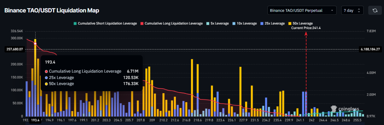 但需注意,193 美元关口聚集爆仓重灾区。一旦 TAO 价格跌至关键位,将引发约 671 万美元的多头集中爆仓,或导致连锁式抛售风险迅速放大。当前价格下方的大量爆仓盘,成为 TAO 后续回调时的极大隐患。