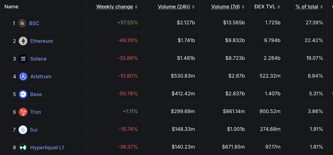 BNB Chain,這個先前與幣安(Binance)相關的區塊鏈生態系統,已躍升至 DEX 市場首位,超越以太坊和 Solana。