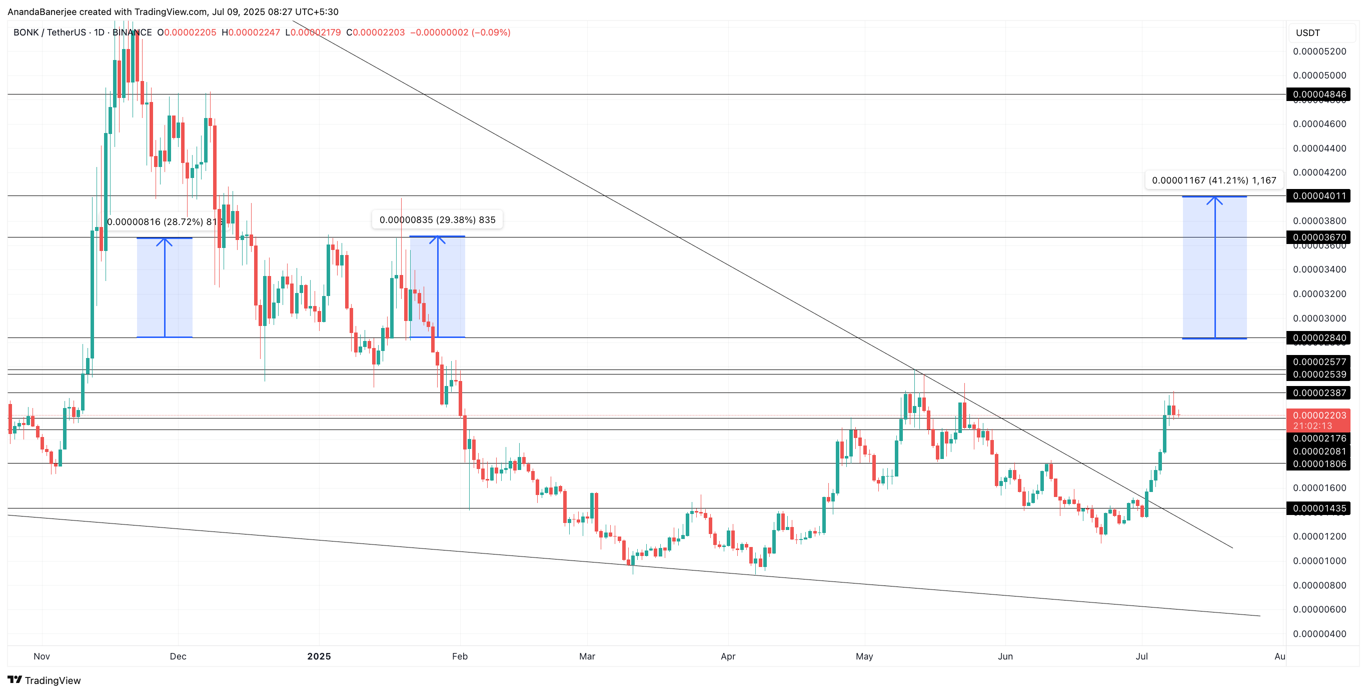 如果这一交叉在未来几天得到确认,BONK 可能突破 $0.00002840 的阻力位,并尝试向 $0.00003600 或更高的水平进发。
