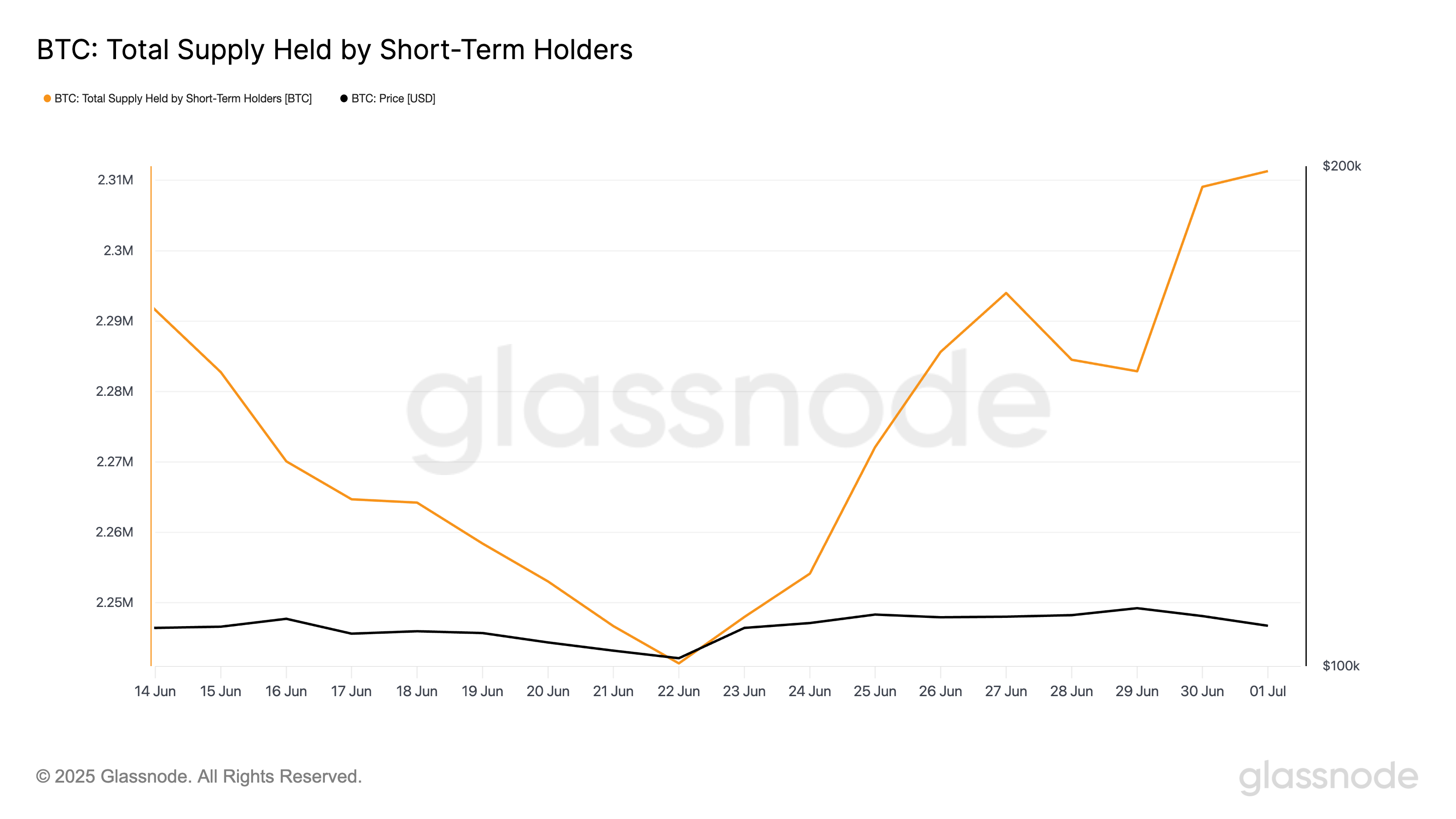 根据 Glassnode 的数据,比特币短期持有者持有的总供应量在 6 月 22 日降至年内低点 224 万枚,此后强劲反弹。目前达到 231 万枚,这些较新的或反应更快的投资者,通常被称为“弱手”或“纸手”,已购买了 70,000 枚比特币。