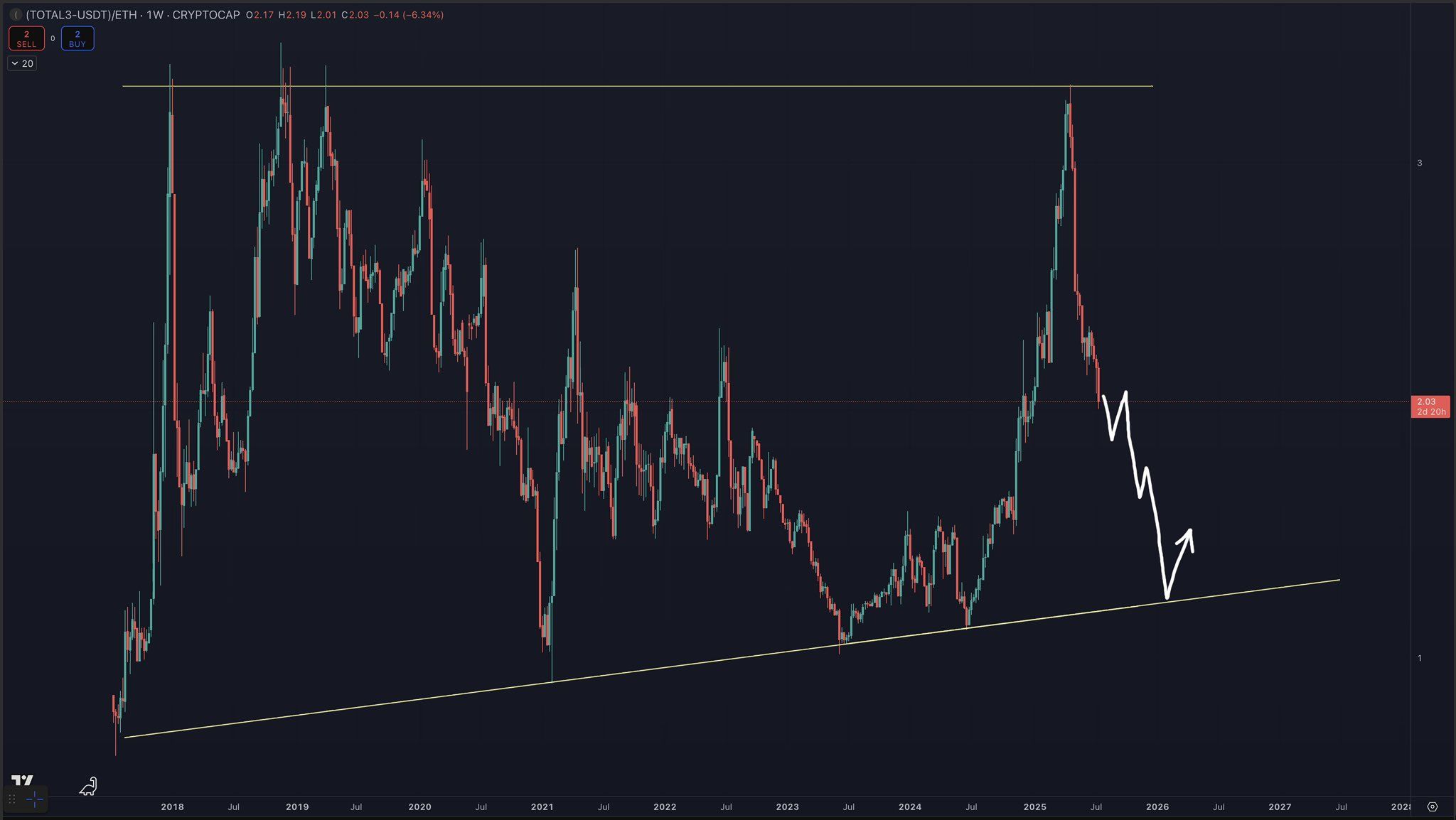 “现在是 $ETH 的季节。$ETH 可能会在一段时间内表现优于较小的山寨币。如果让我猜测,我会说走势可能会这样发展,跌至下方趋势线。当这条线下降时,意味着山寨币相对于 $ETH 失去价值。只有在牛市的最后阶段,山寨币才会表现得比 $ETH 和 $BTC 更好。”Colin Talks Crypto 预测道。