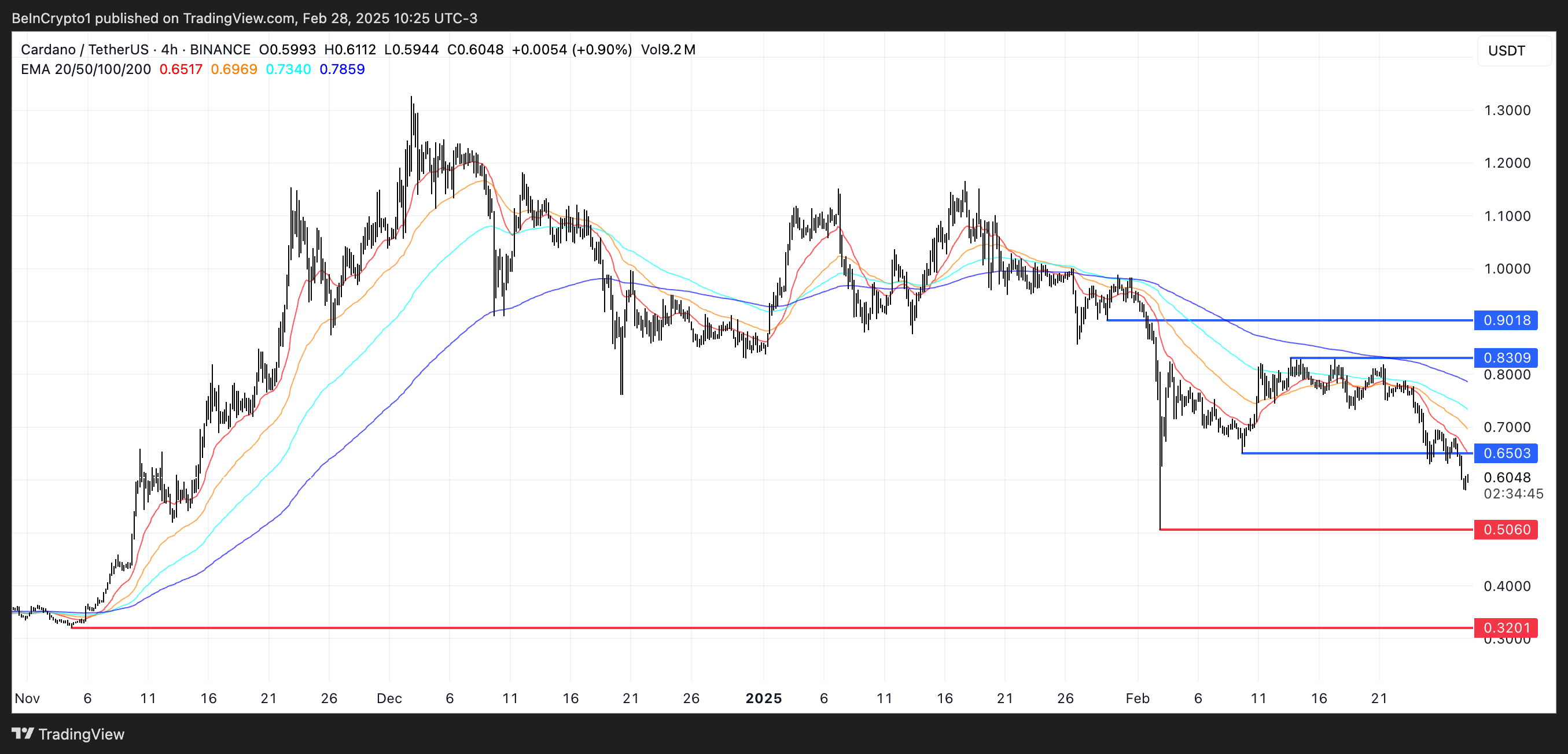 如果這一跌勢持續強勁,ADA 可能測試 0.5 美元的關鍵支撐位。如果失守,價格可能進一步下跌至 0.32 美元,創下自 2024 年 11 月初以來的最低水平。