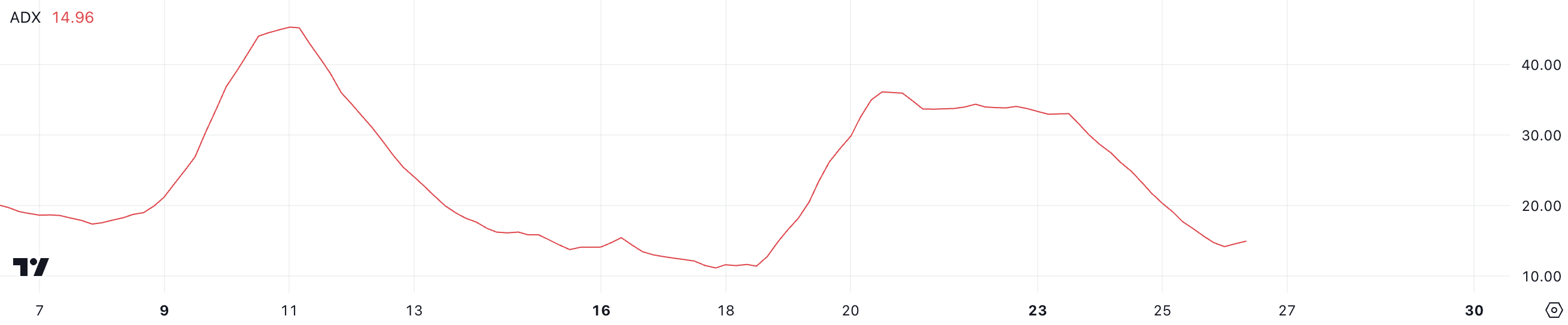 ADA 平均方向指數 (ADX) 目前為 14.96,較三天前的 30 多大幅下降。這一顯著下降表明趨勢強度減弱,暗示持續的下跌趨勢正在失去動能。