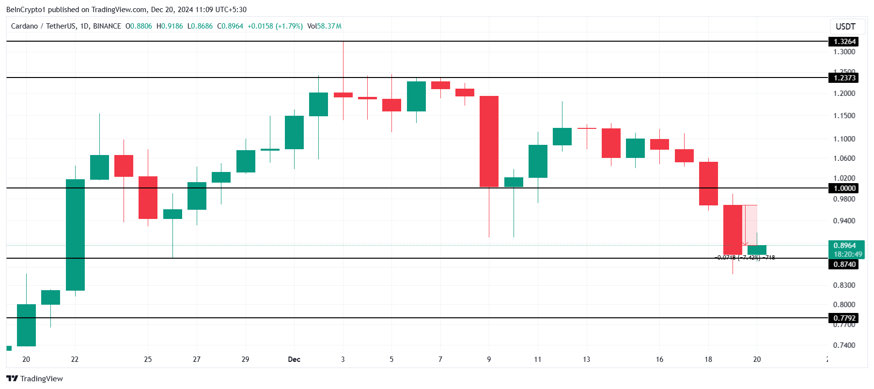 在0,89 USD,Cardano的價格在經歷24小時內7%的急劇下跌後,仍高於其關鍵支撐位0,87 USD。加密貨幣能否保持在此水平之上,對於短期內維持看漲情緒至關重要。