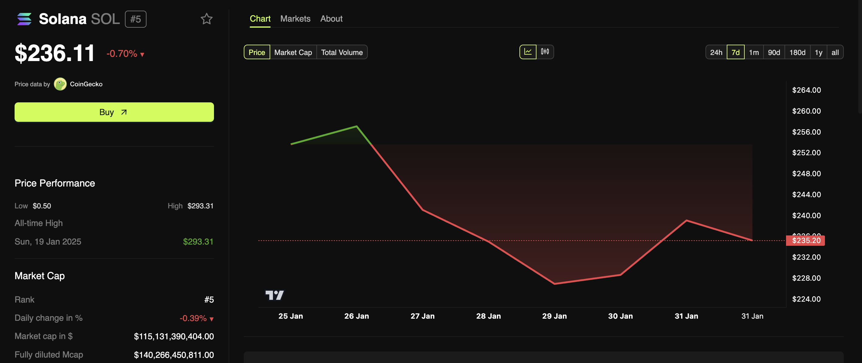 同時,在價格方面,SOL 和 HBAR 繼續掙扎。 截至發稿時,Solana 交易價格為 236.11 美元。這表示過去一週下降了 9.09%,過去 24 小時下降了 0.70%。