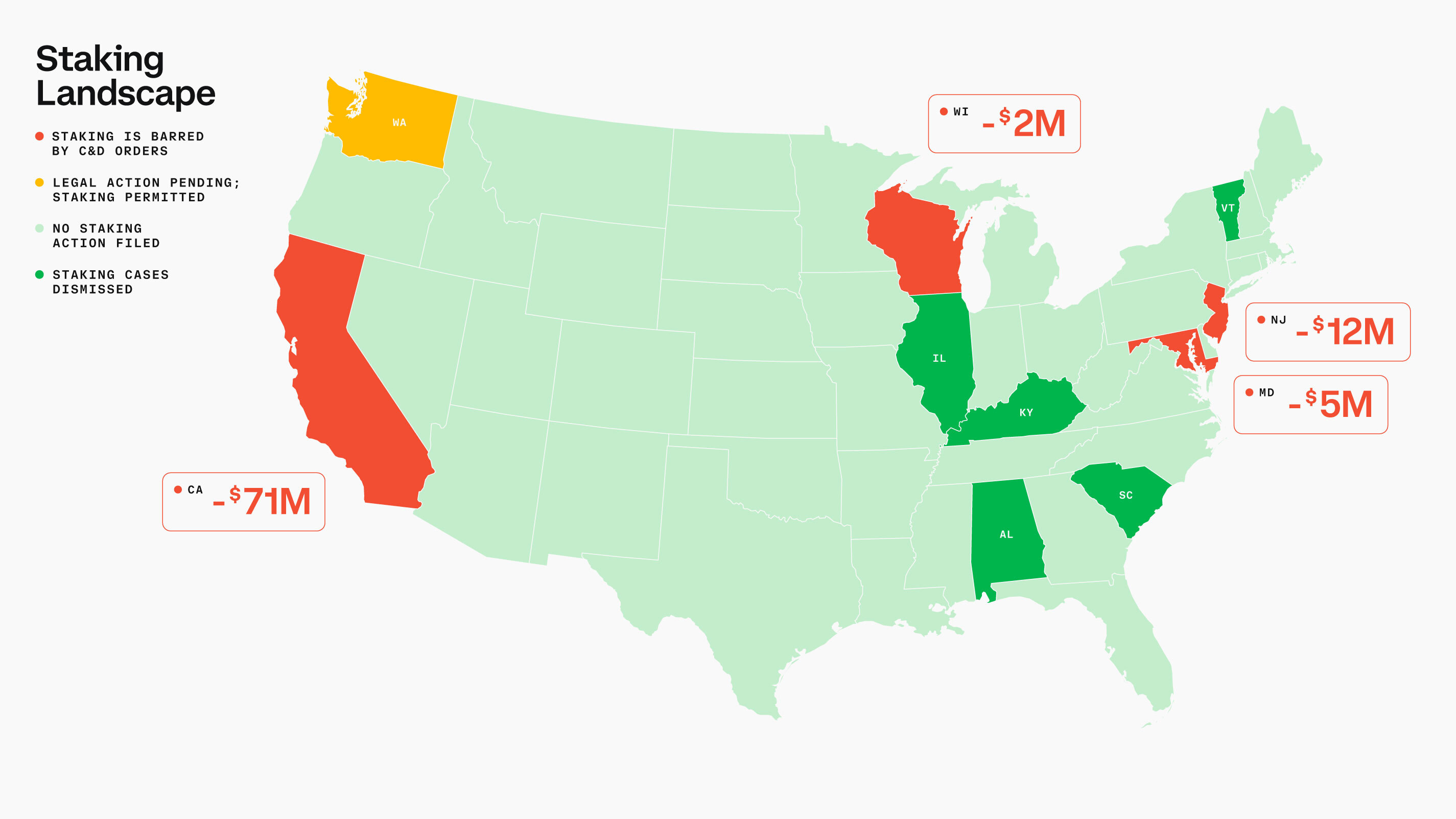Coinbase 的首席法務官 Paul Grewal 表示:「這些堅持不放的州通過禁止居民使用安全的財富增值工具如質押,積極損害了他們的消費者。他們已經讓這些美國人損失了數千萬美元的潛在收益,且損失還在增加。」